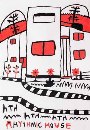 動物や昆虫などすべてまろやかに表現します。苦手な尖った感覚をろ過するように、角丸でほのぼのと仕上げます。提案すると、「描いてみようかね」とのんびり始めます。赤黒シリーズの絵も陶の動物も温かくユーモアがあり、楽しい気持ちにしてくれます。